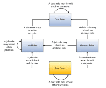 - Duty Roles: This role defines a set of tasks. It is the most granular form of a role. The job and abstract roles inherit duty roles. The data security policies are specified to duty roles to control actions on all respective objects.